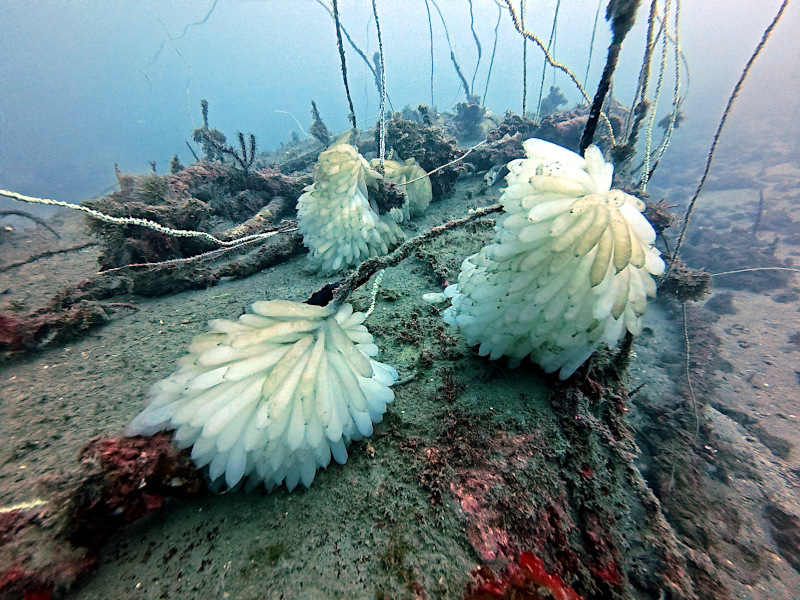 アオリイカのために入れた産卵床ではなく古いロープ溜まりに産み付けていました。