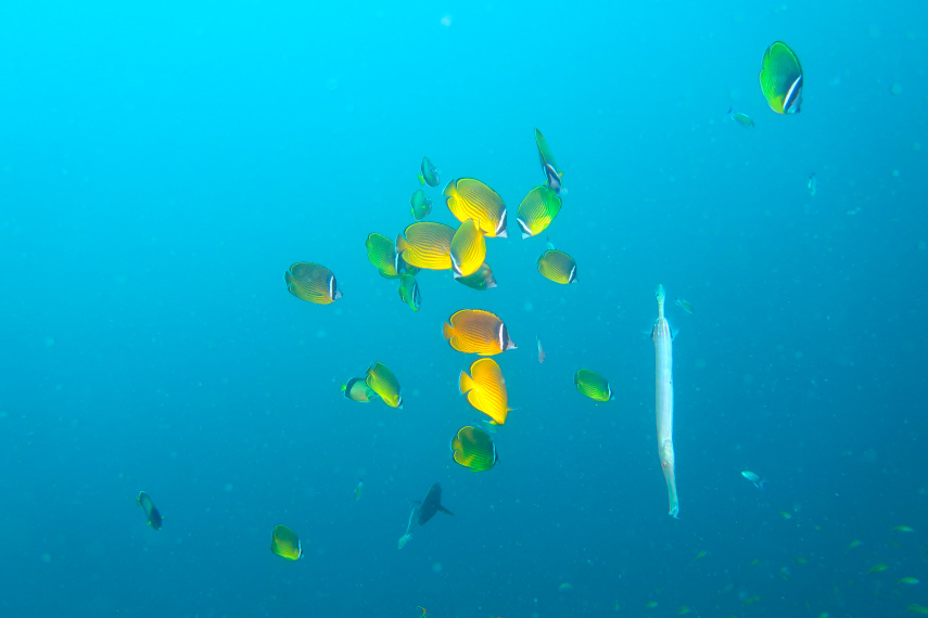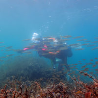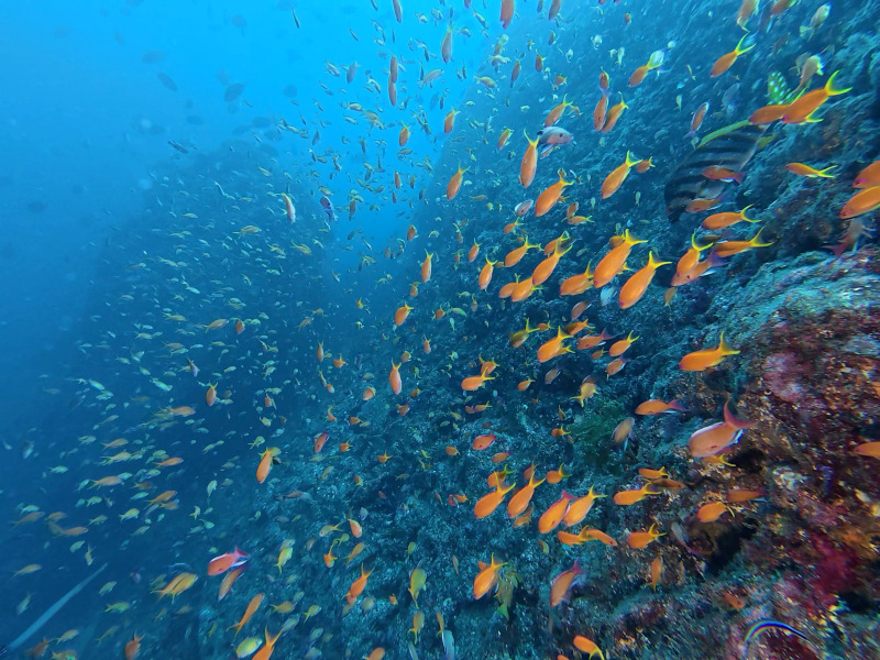 最後は浅くて暖かくて明るい岩の上で安全停止がてらのんびりしていたらブリの幼魚がすごい群れ。
