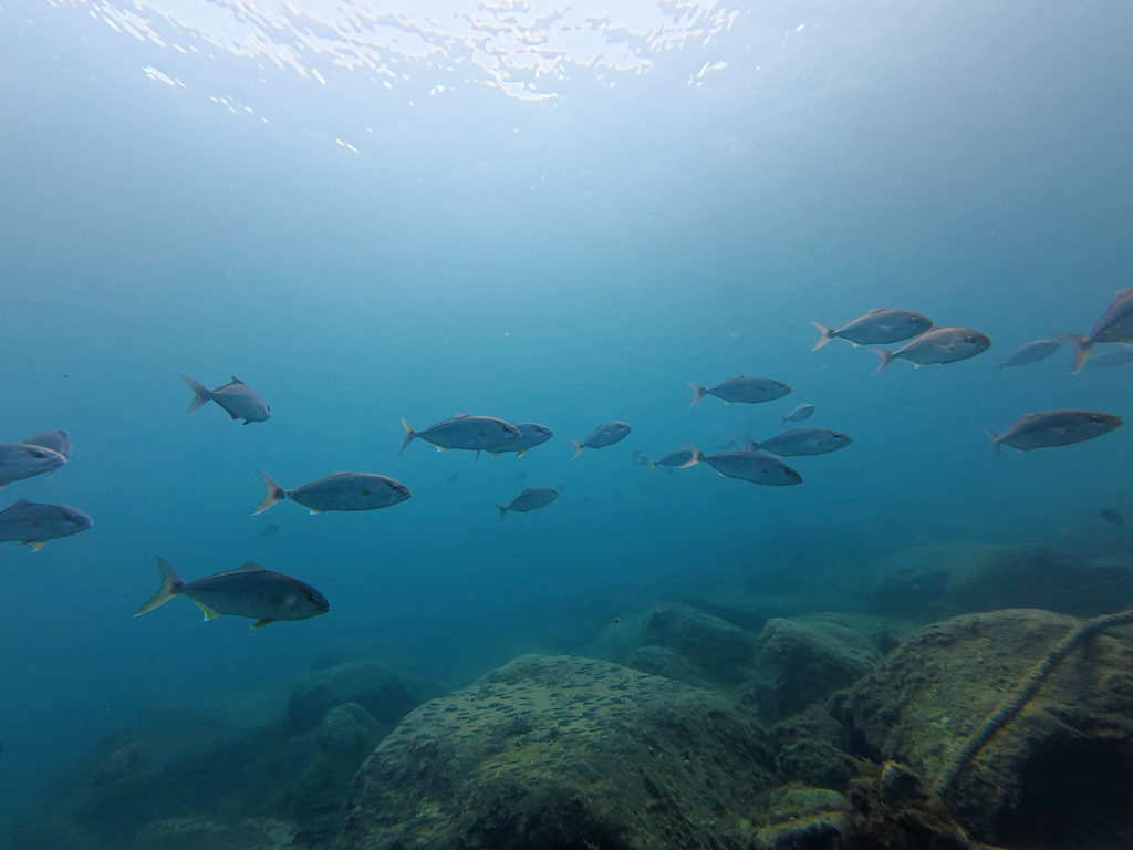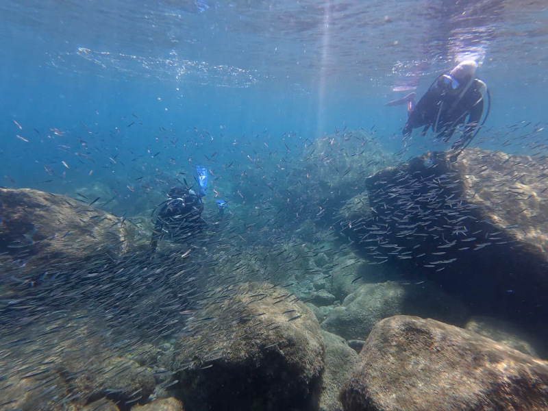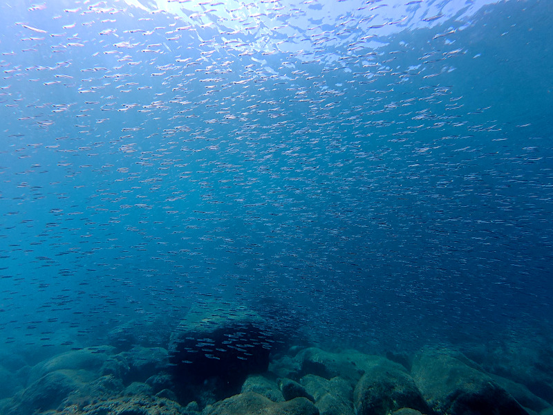 でもゴロタに上がって浅場をのんびり泳いでいるとキビナゴやらなにやらの幼魚の群れがすごい!