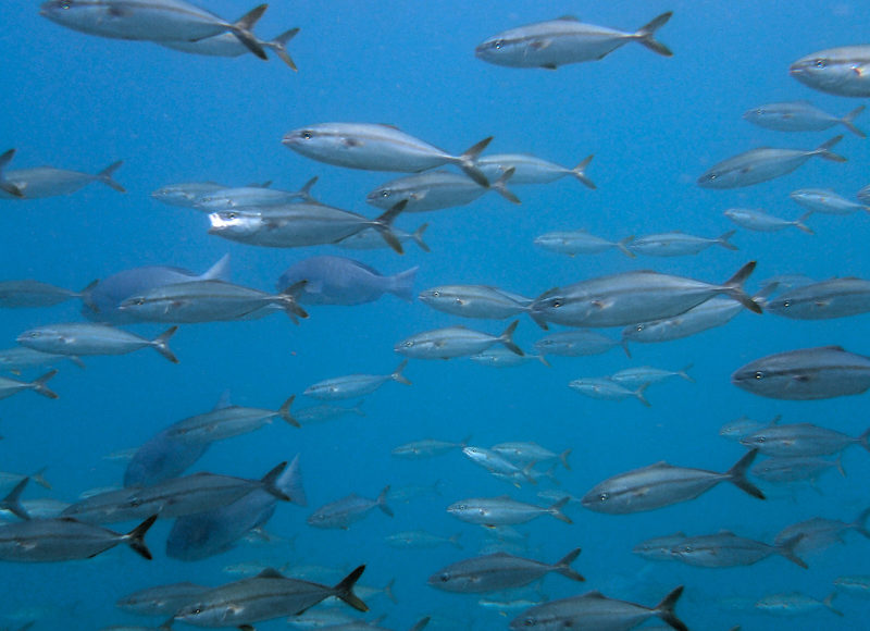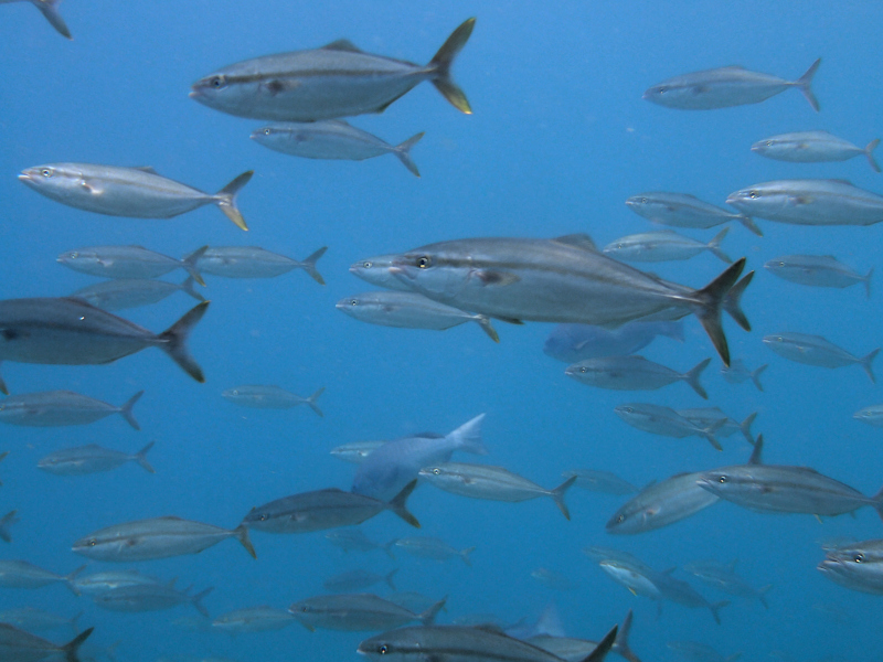 そこに子カンパチ軍団やワカシ(ブリの幼魚)群れ、ツムブリの子も混じって賑やか!