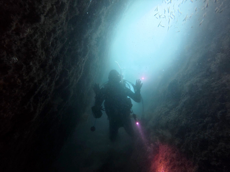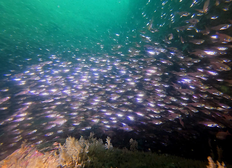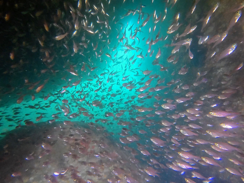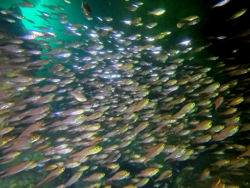 穴の中は魚グッチャリ、群れ群れにここまでつつまれれば透明度がよくなくても関係なしですね!