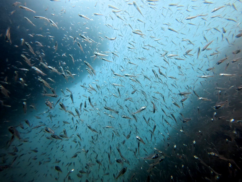 浅場を泳いでいても表層のキビナゴはかすんでみえたりくっきり見えたり。