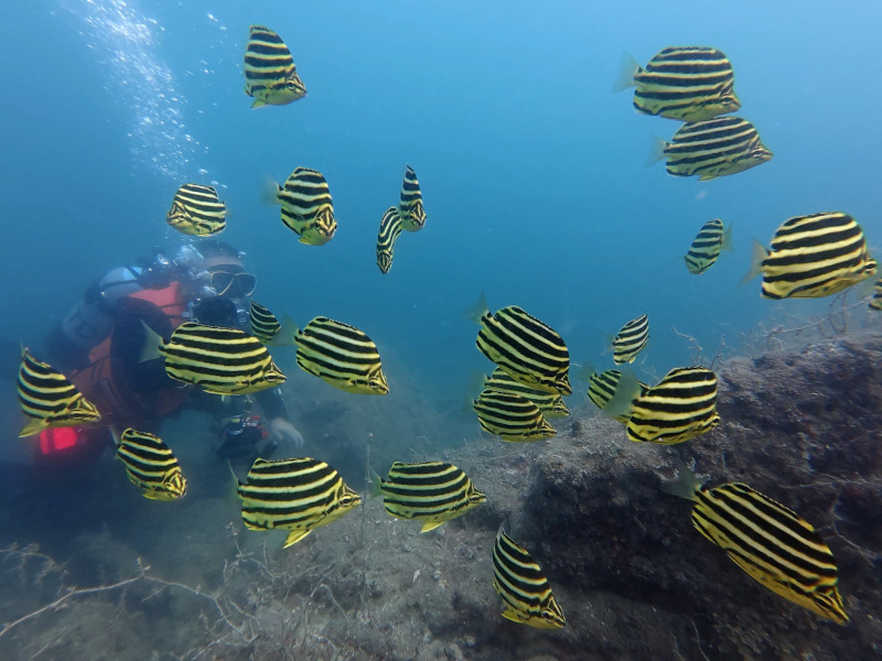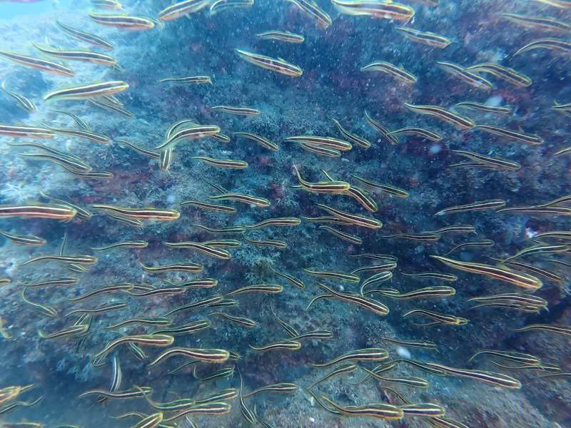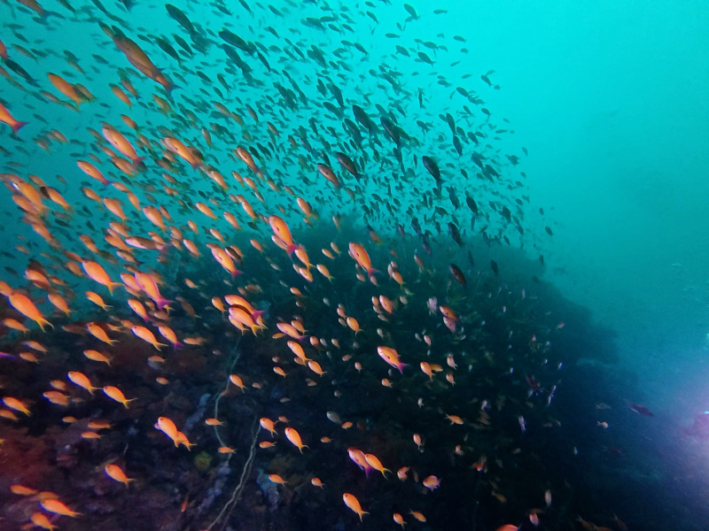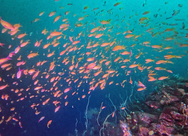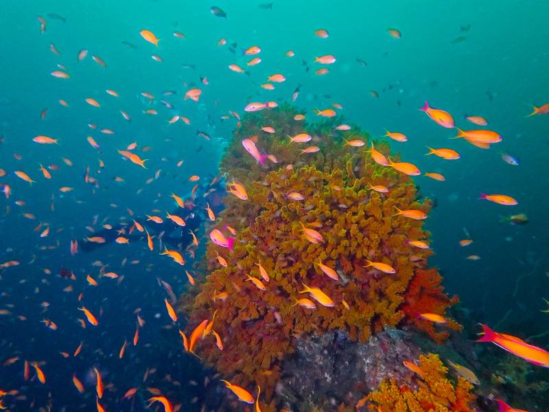 キンギョハナダイやサクラダイメス、少し離れた場所にはイサキの大群など。