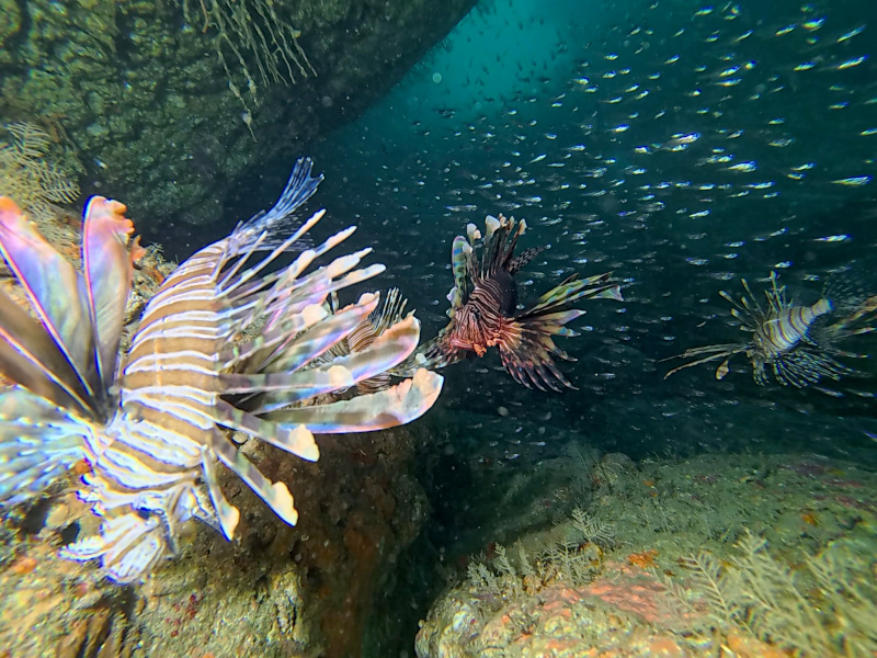 H穴の中には小魚たちを狙って集結したミノカサゴやオオモンハタたち。
