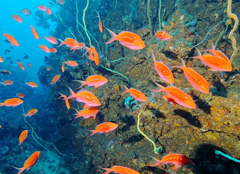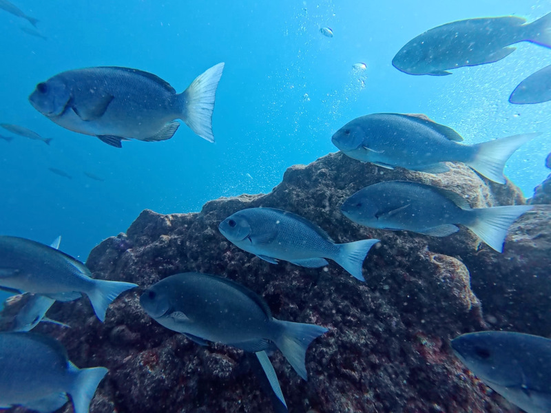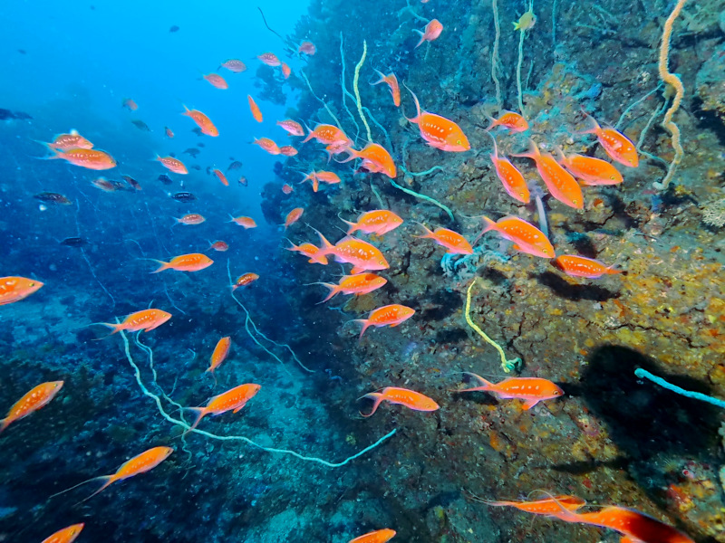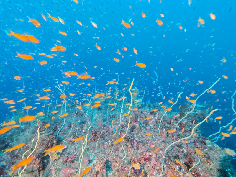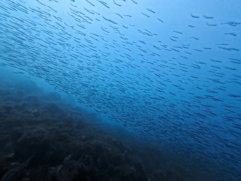 海面自体は波立っていませんが波長の長いうねりがあり、外海ポイント潜っていると浅い水深で横にぼちぼち揺られます。