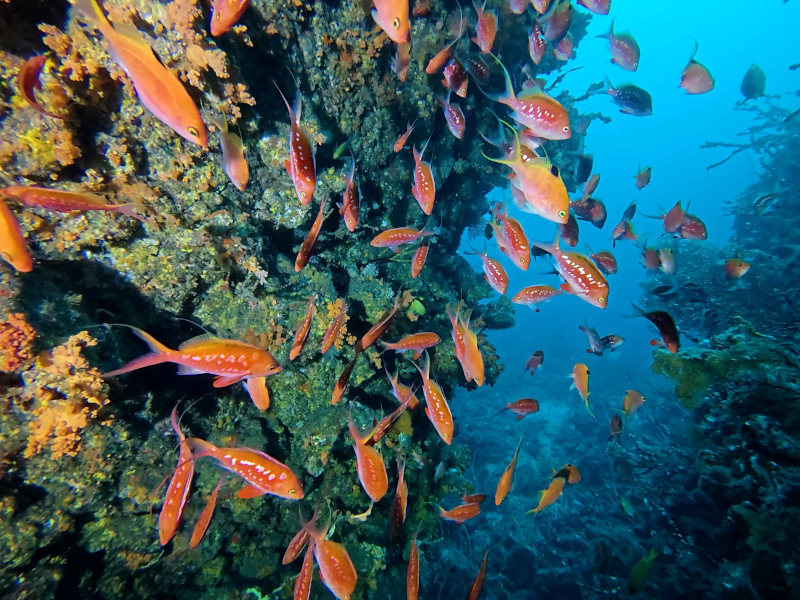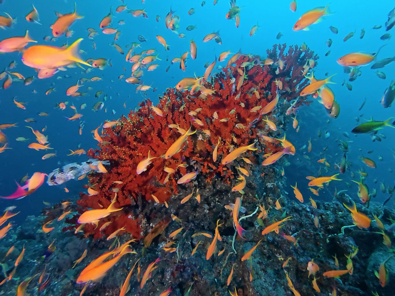 ナンヨウキサンゴのまわりで群れ群れなキンギョハナダイ
