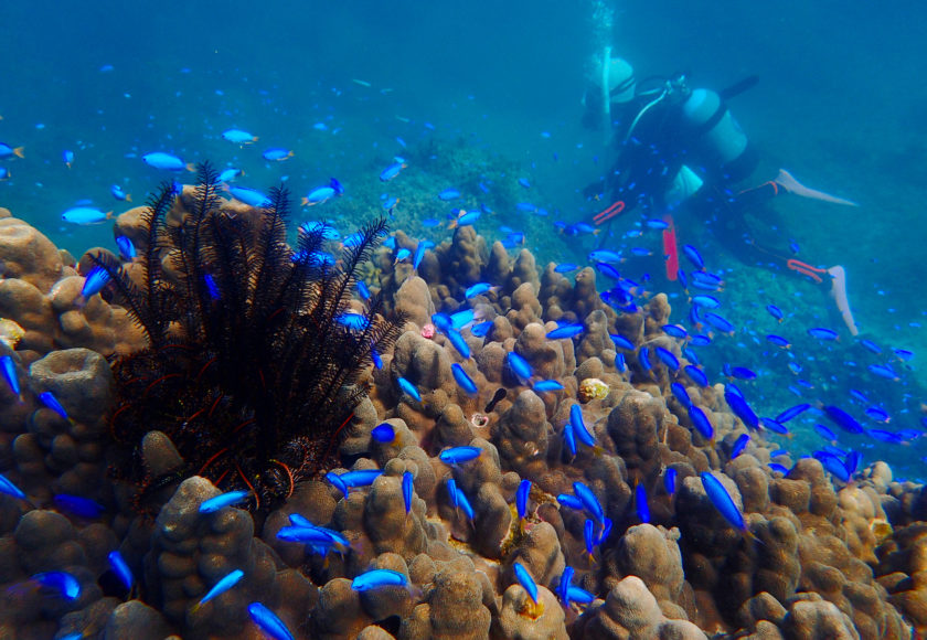 ナンヨウキサンゴのまわりで群れ群れなキンギョハナダイ