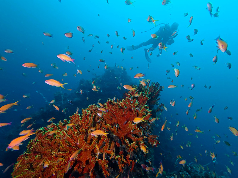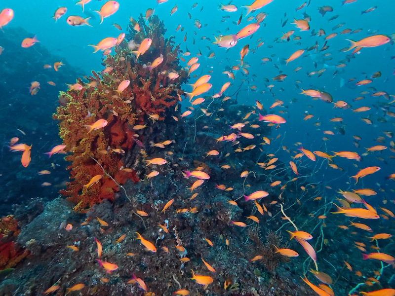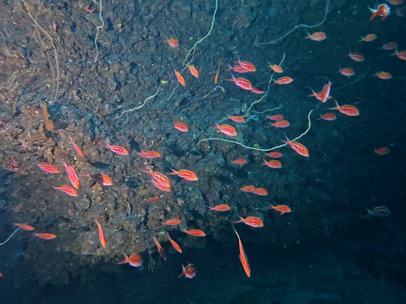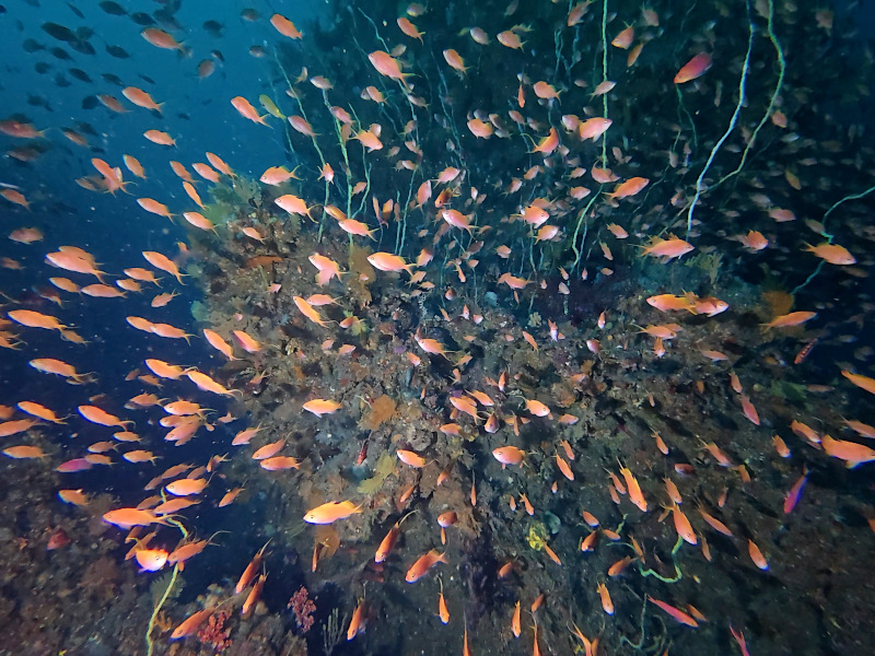 深場の花園はサクラダイのオスは最盛期の集合にはまだまだですが、メスの集合にナガハナダイやアカオビハナダイが混じっての光景などはいい感じです。