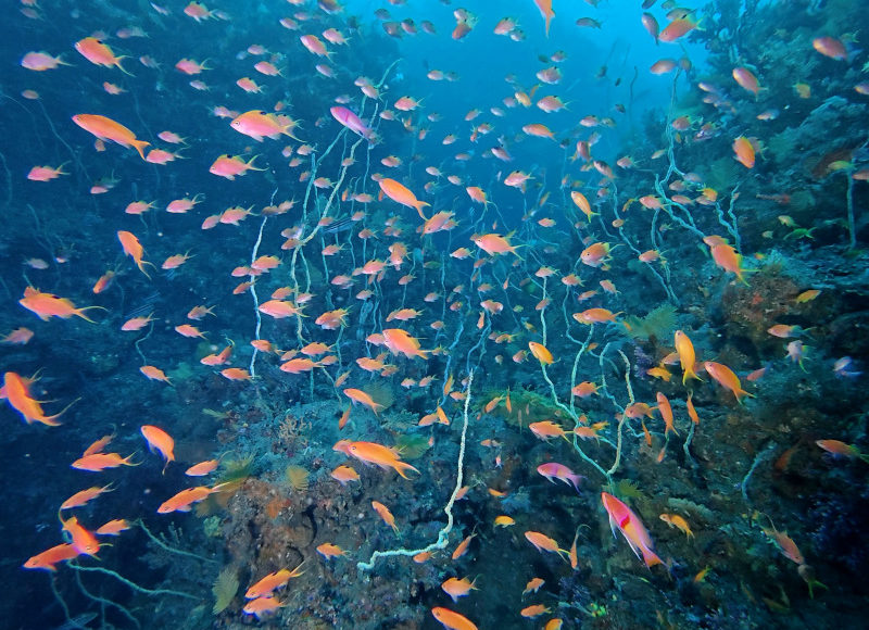 深場の花園はサクラダイのオスは最盛期の集合にはまだまだですが、メスの集合にナガハナダイやアカオビハナダイが混じっての光景などはいい感じです。