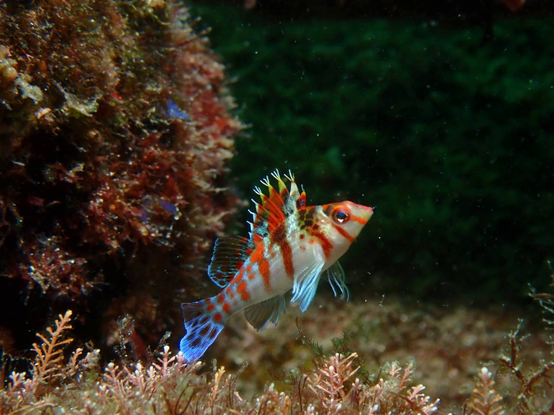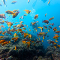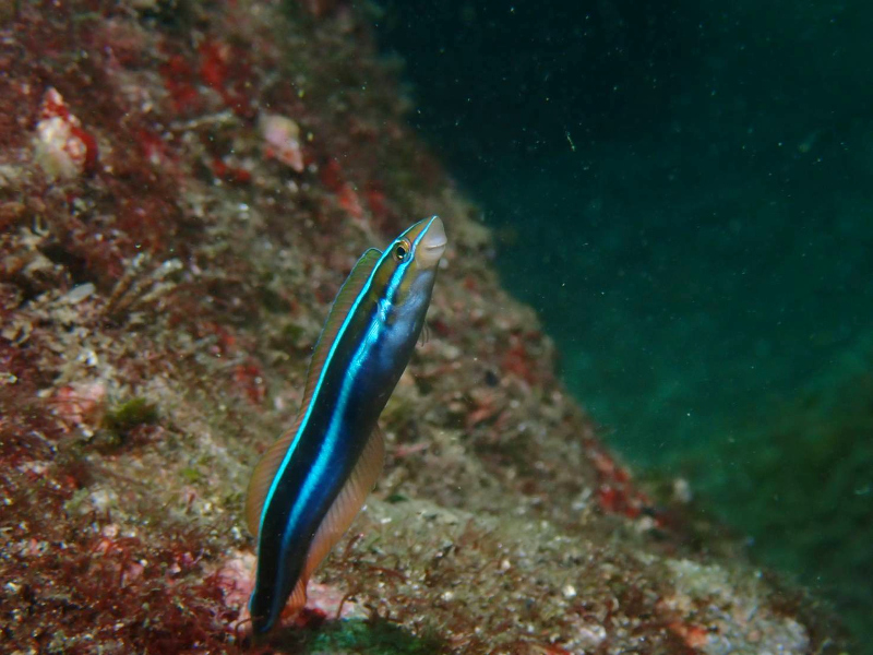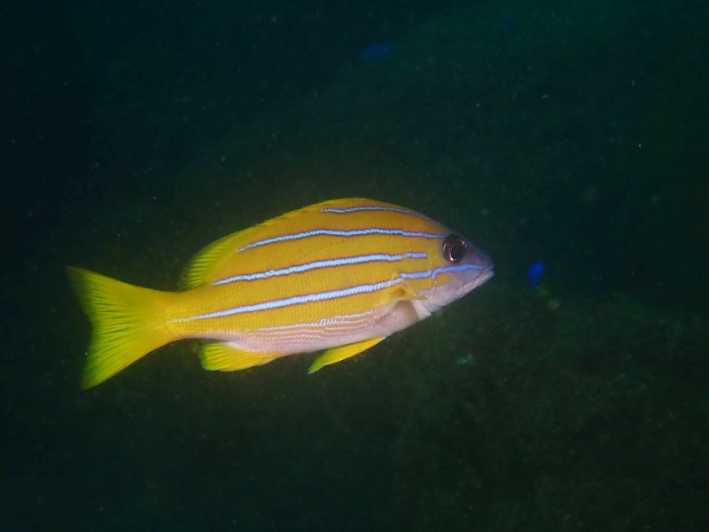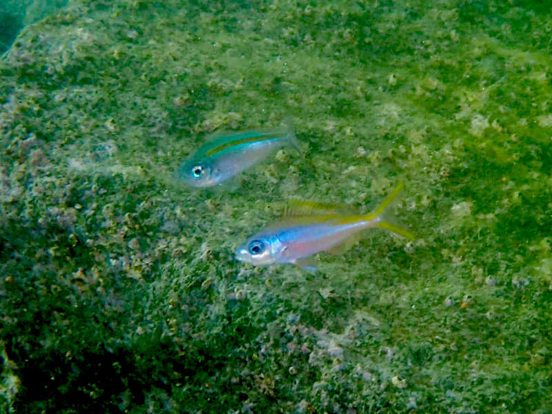 いろんな形の魚礁やゴロタ付近にはアカオビハナダイ、ネンブツダイの子やヨスジフエダイの子がいっぱい。