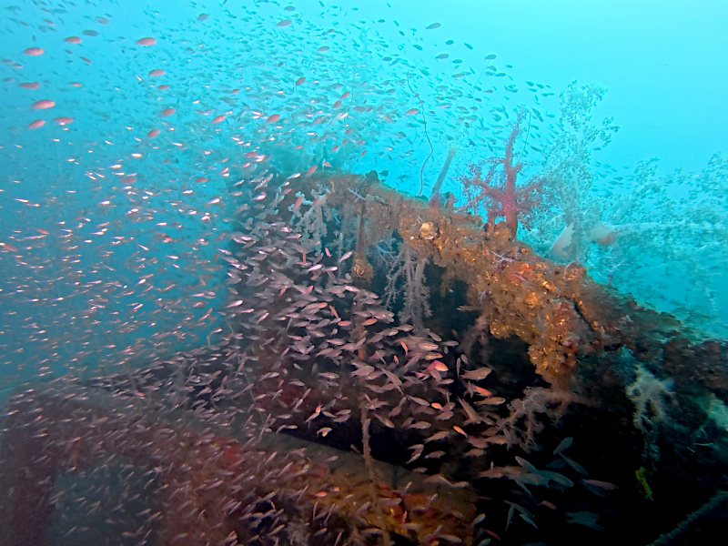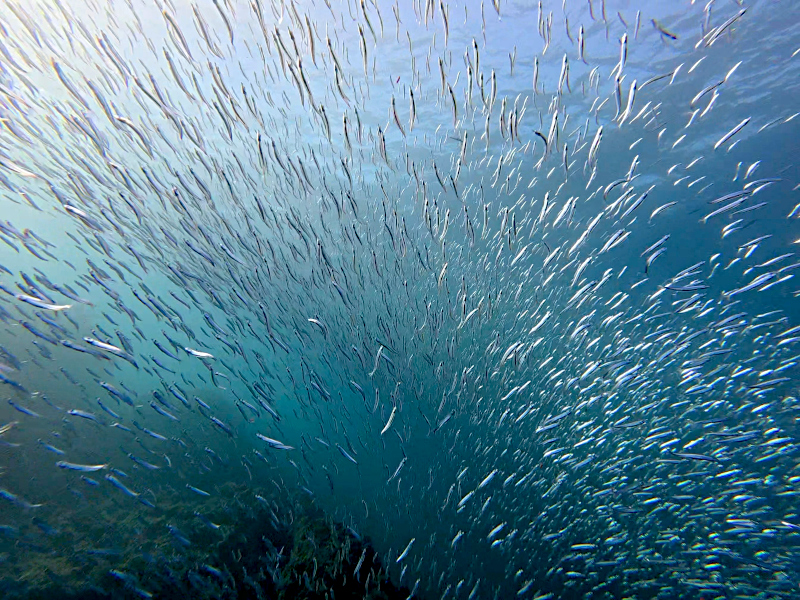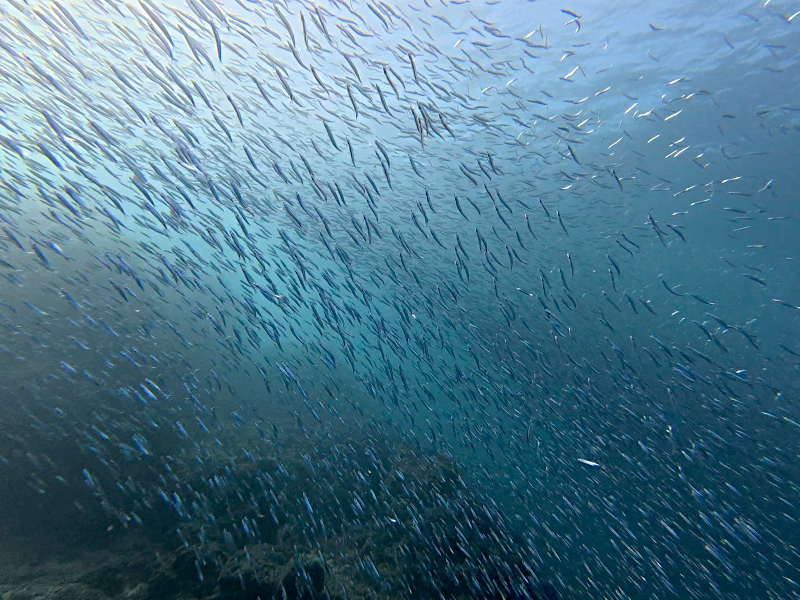 時化の割に透明度は良好、水温は18.5℃を示していました。前日は17℃だったとのことなので上がったんですね。