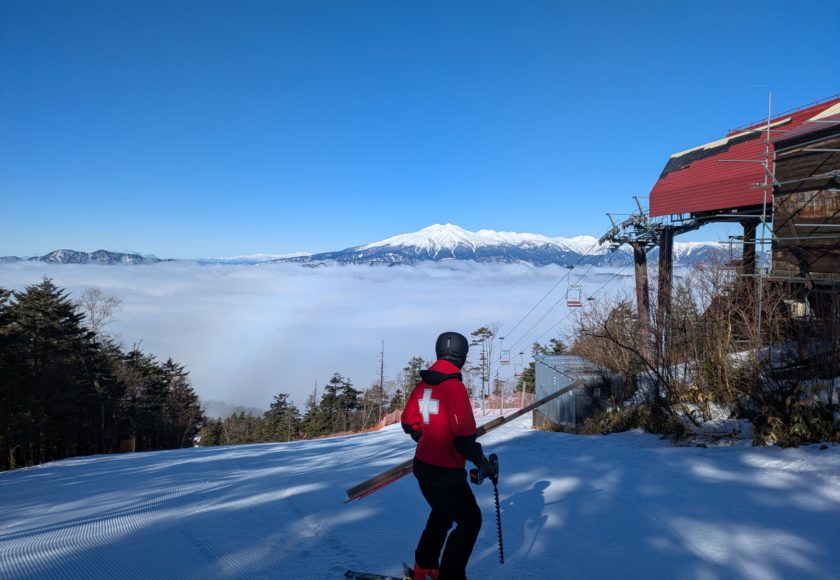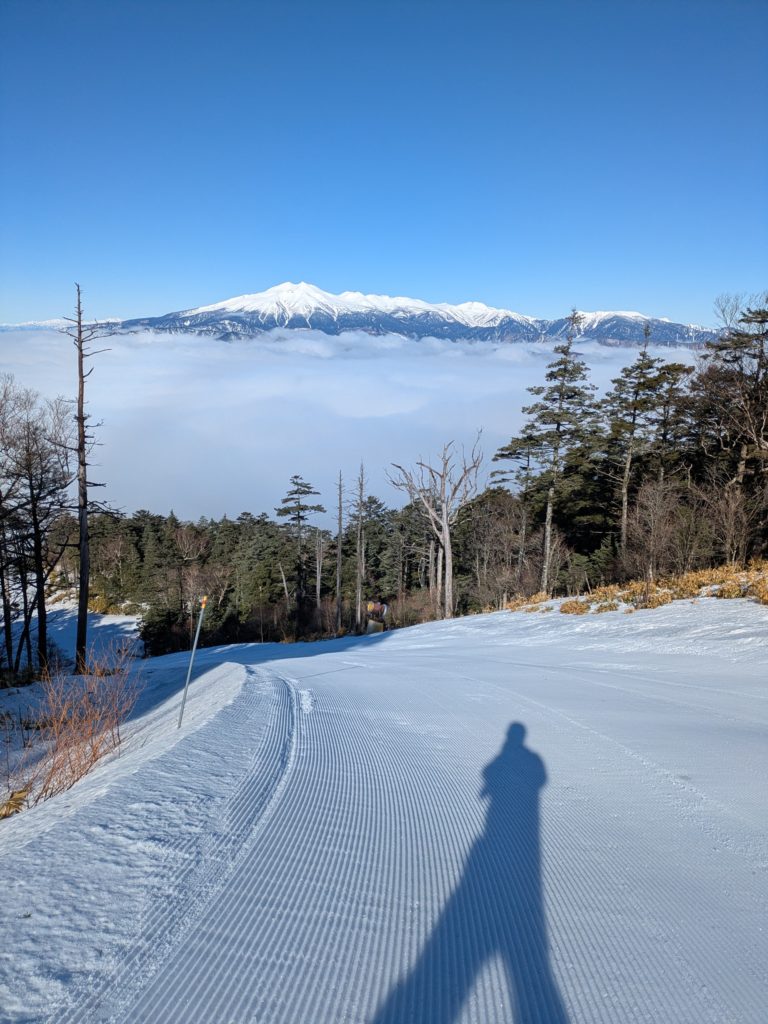 望む乗鞍岳の下に見えるのは雲海です。エキスパートコースにて