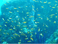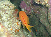 ・ やっぱり予定は変わっちゃってメンバーのリクエストもあって土肥の限定開放ポイントに潜ることになった。とは言ってみたが今回のメンバーは土肥もずいぶん潜っていて小下田地区が好きで楽しければ限定ポイントにこだわらないといった感じ。結局1ダイブ目は潮の状態などの理由で限定ではない飛島沖からエントリーする。地形の変化も楽しむならどうもこっちから入ったほうが楽しい気もする。北の根から入って穴をくぐり限定の飛島Uエリアにある西の根に行く。マアジの群れやネンブツダイ、サクラダイの群れは相変わらず多い。しかし、絶好調の魚影とは言えない。これでこのダイビングはハズレというにはあまりにもったいない飛島沖である。だからこそ、状況を見て飛島Tから入るのである。西の根をグルッとまわって今度は南の根へ。いつも思うが西の根方面から見上げる南の根がいちばんかっこいい。根をまわりこみながらてっぺんに上がって行く。ここの根頭は水深10m程。今日は天気もよくキンギョハナダイの群れがすごくきれい。下を見下ろすとコワイくらいのドロップオフ。あとは船長さんとの打ち合わせ通り他の船などに注意して浮上。帰りのぶんを考えずに行けるよくばりゆったりコースの飛島であった。