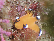 さて、八木沢の沖漁礁。普段は土肥の漁師の大事な漁場とのこと。イサキ、マアジ、カツオが実によく釣れるらしい。とは言っても、いつも出港する八木沢港からほんの数分で着いてしまう。水深20〜23mの砂地に漁礁が積んである。エントリーして水の良さにまずうれしくなり潜降してたまげた。本当にたまげるような魚の数であった。主にクロホシイシモチの大群で漁礁ブロックがまったく見えないのである。それも潮上、潮下とかに関係なく約50mにわたって積んである漁礁全体が分厚く魚達に覆われているのである。ここまでの魚の数はこれまでに見たことあるだろうか...その上にはマアジ、イサキ、スズメダイの群れが泳ぐ。評判のソフトコーラルを見るには魚をかき分けてもぐりこまなければならない。そこには特大のトサカ、ヤギなどのソフトコーラルが豊富に付いている。その他クチグロ(イシダイの老成魚)80cmクラスのヒラメ数枚、ピカチュウウミウシ(通称)など。他にもきっとたくさんの生物がいそうだがあまりの魚影に落ち着いてさがせないほど。 春から秋にはイサキ、マアジ、カンパチがすごい数でまわってくると漁師さんが言っていたがこれはうなずけてしまう。ダイバーが潜っている場所以外で漁師さんが隠している?すんごい場所がまだまだあるのかなぁなんて考える。水温は低くそれなりの装備をしないと確かに寒いがそんなことを忘れるくらいの魚影を見られてすっかりご満悦軍団であった。