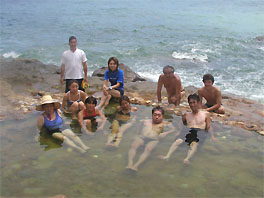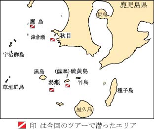 昼休憩は硫黄島で。お弁当のあとは温泉へ。硫黄分の強い温泉はいつものようだがそばの岩のくぼみにあった冷たくて白い風呂(水溜り)のほうが日に焼けた体には心地よく人気。それから波打ち際のがけからお湯が滝のように落ちている場所がありその下の海に入るとまったくのお湯。たまにうねりが打ち寄せ転ばされそうになりながら浸かる温泉はスーパーワイルド。