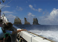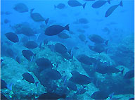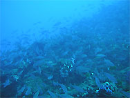 2ダイブ目は前回も潜ったヤクロ瀬へ。しかし前回はドロップからすぐに浅瀬に向かった。今回はずっとドロップオフをたどってみよう。水面から出ている岩からそのまま水深40〜50mまで垂直に落ち込むみごとなドロップオフである。水は見ごり気味かな。しかし魚がいない...壁にはタテキンの幼魚やハナゴイなどはいるが外側はガランとしている。ちょっとがんばって潮上に向かう。ずいぶん進んだころ潮が強くなる。偵察に一人で行ってみると。魚群の影が見える。さらに進むとニザダイのすごい群れ、ツムブリ群れ、ムロアジ群れ、ムレハタタテダイ群れ、大きなカスミアジの編隊、巨大イソマグロを先頭に悠然と泳ぐ編隊。こんなところにいたのね。みんなにもきてもらう。おわりよければだいたいヨシということに。結局はダイナミックな魚群に囲まれて満足。