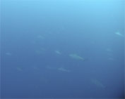 最近の伊豆の水のよさはもちろん神子元でも!この夏2回目の神子元遠征。海はほぼ凪、天気も暑すぎず絶好のコンディション。船が神子元に近づくと潮がかなり流れているのがわかる。カメ根の横でエントリーし根を伝って沖に進むと次第に潮の流れが強くなる。潮流は根のそばで上下左右にガンガン巻いている。魚も泡も舞う感じである。タカベやニザダイが舞う姿がかっこいい。エントリー前に水面で小ぶりのハンマーがいたが色気は極力おさえて沖へ進む。途中メジロザメが前方を通ったがすぐいなくなる。ラスト10分で根を離れ底の見えないエリアを水深をあげながら流すとまずメジロザメが数匹、続いてハンマーが1匹、2匹と登場。時間もエアーもエキジットを促したころ、下のほうでドカーンとハンマーの群れが登場!群れの先頭も最後尾も見えないくらいの数。100匹以上はいたであろう。もう浮上しなければならなくて斜め上からみんなで見たが(上げていたフロート捨てちゃったアホもいたが...)大迫力の大群はみんなはっきり目に焼き付けたようだ。2ダイブ目はこうなると色気を抑えきれない。そんなわけで色気、殺気を持ったときにはスカの法則がバッチリ適用されてしまった。