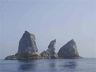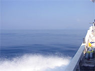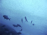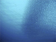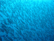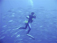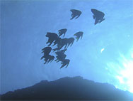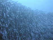 鷹島でもう1ダイブするつもりなのだがとにかく潮が速く洗岩も沈み瀬も潜るのにはかなりきつそう。つらいダイビングは極力避けたいのであちこちさがしたが結局大きな岩(島?)の際をペローンと流してみることにする。あまり水中には期待が持てないがもう仕方ないねといった雰囲気。しかし...エントリーしたとたんキビナゴの大群に囲まれた。流れも水面と違いゆるい。おあつらえ向きの外に張り出した岩礁で走りまくるキビナゴの大群とそれを追いまわす数十匹のカンパチ(含、ヒレナガカンパチ)、ソーダカツオ群れ、ツムブリ群れ、などがすごい状態になっているのに見とれてしまう。なんとなくみんなデジカメやビデオをおいてきたことに悔やんでしまう。あまり期待をしていなかったのにスピード感あふれる大満足の1ダイブであった。