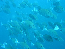 潮流はやっぱりかなりの速さでした。泡はぐるぐる舞いながら下に行ったりしています。そんなかタカベ、イサキは大群で泳いでいます。大きなカンパチの編隊は見たもののサメ君は不発。でもアップにダウンのあちこちに向くカレントと水面では泳いでもないのに私の周りをメンバーたちがクルクル回って「??オイラをいじめてるのかな?」と思ったら渦潮状態でまわされていたらしいです。そんな潮を楽しんだ?1ダイブ。午後はすっかり潮流もゆるみさきほどのタカベの大群も減ったみたい。でもトビエイ×2、ニザダイ大群、イサキ大群などが見えました。これで終わりかと思ったら上のほうにハンマーヘッドが2匹ヒョロローンと泳いでいました。今回は大群とは行かなかったけど対面できたのはありがたかったですね。「たかが2ピキ、されど2ピキ!」といった感じでした。