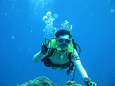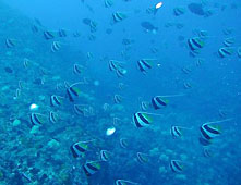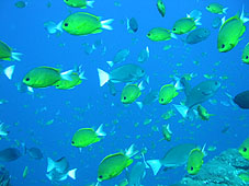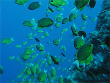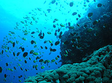 沈み瀬付近はけっこうな流れ。でも昨日も潮流はあったしこのくらいならまったくOK。潮上から飛び込んで根(瀬)につくといきなり魚だらけ!タカサゴ、コガネスズメダイ、メジナなどがいっぱい。ハード、ソフトともにサンゴがとてもきれいです。上にはムロアジ、ツムブリなども行き交います。いやいやなんとにぎやかな水中でしょうか。