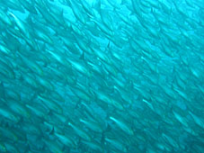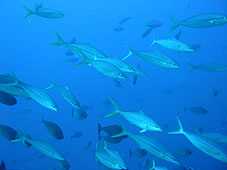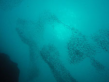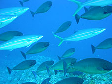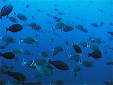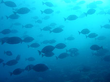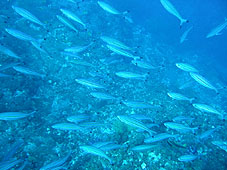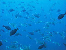 エキジットしながら潮がガンガン当たっている岩が気になります。メンバーが休んでいる間に見てこよう。タンクを下ろさずそのままボートで行って見ます。潮流が岩に乗り上げんばかりに当たっています。視察メンバー3人で飛び込みます。岩に当たって吹き上げる潮を越えて潜降するとやっぱりいました魚たち!ニザダイ、テングハギモドキ、タカサゴ、メジナ、ツムブリなどの群れが視界いっぱいに群れています。中にはメジロザメも混じっていたり。その下にはムレハタタテダイの大群です。