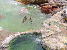 温泉もとりあえず貸しきり状態です。今回はなんだかとても熱く感じた東温泉です。だからかみんなは波打ち際に滝のように落ちるほうの温泉?に浸かっていました。