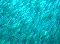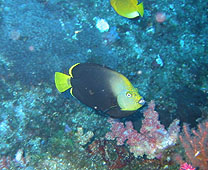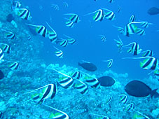 千貫瀬は定評のある通称「小瀬」に釣り船がいてすぐには潜れません。ではということで少し離れた「大瀬」のほうへ。根(瀬)のトップは2mもないほど。まわりは一気に落ち込んでいます。大きな根が入り組んだ小瀬とは感じが違いますが魚たちが出だしたときのパワーはさすが千貫瀬。イサキ、タカサゴ、ニザダイたちのすごい群れです。それにあたりまえのようにサザナミヤッコやモンガラカワハギがいるあたりさすが鹿児島です。