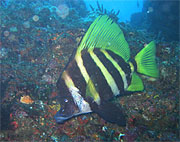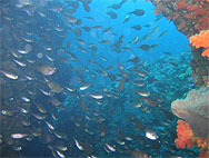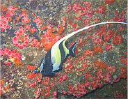 ・しばらく吹きまくっていた西風もおさまり北東の風でほぼ凪でした。(午前中はうねりが残っていましたが次第に静かに)ということで外海に2ダイブしてきました。 水はさすがにしばらく荒れたあとなので白っぽくなっていますが不自由はぜんぜんないくらいの水です。沖ノ島はエントリーしてすぐにキビナゴの群れがいました。がんがん走っていてなかなか見ごたえあります。スズメダイ群れ、タカベ群れ、メジナがたくさんいたりハマフエフキがいたり。このポイントらしいプチケーブをのぞくとハタンポやクロホシイシモチがたくさんいました。イセエビも! フトネではやはりキビナゴ群れ、テングダイ、集結してきたアオウミウシサクラダイ、キビナゴを狙う大きなマダイ数匹。それから下がってしまった水温の中南から流れてきた魚もまだがんばっていました。でもクマノミはさすがに減ったかな?
