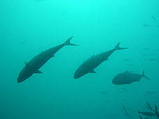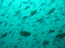 あるいは海は泥水に覆われているかもと覚悟しましたが少なくとも茶色ではありません。水面から5mあたりまでは白っぽく濁り気味ですがその下は6〜7mは見えていて水深15mも行けば透明度10mは見えています。もっと深く行けばもっと見えていそうです。水温も水深25m付近でも22℃くらいです。魚は相変わらずでスズメダイ、タカベ、イサキなどがいっぱい群れていて見ごたえある魚群を形成しています。根の上にはキンギョハナダイがぐっちゃり、下のほうにはサクラダイがぐっちゃり、きれいです。1本目は大きなカンパチがトリオでずっとうろうろしていましたし2本目は20匹ほどのハマフエフキの群れ(顔は悪いけど大きいので)が迫力満点でした。大きくてふてぶてしいマダイやトビエイも登場してくれてみなさん満足のフトネでした。