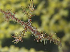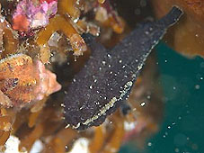 ・今日は曇りの始まりでした。ずっとさわやかな青空の日が続いていたのでちょっと暗く感じます。予報を信じて昼食前に2ダイブしましたがはたして雨はすべて終わった昼食中(宇久須、やぶ誠にて)に降り出しました、あ〜よかった。 今日もすっかり楽しい状態の黄金崎です。さっそくリクエストのニシキフウライウオの場所に行くと「??」いません。ヤシャハゼも出ていないし...うーん。でもミジンベニハゼはあいかわらずたくさんいるしヒメヒラタイザリウオもいます。ゴロタの斜面のクロホシイシモチなどの大群もあいかわらず。水面近くにはすごい数のイワシの群れもいて時折ダツに追いかけられています。カイメンに埋もれて顔だけ見えているベニイザリウオや砂地のホタテツノハゼ属1種、ネジリにヒレネジも健在です。すべてはゆっくり見て回れないくらいです。(減圧が出そうで) そして2ダイブ目。もう一度と思って泳いで行くとニシキフウライウオがいました。ずいぶんゆっくりな出勤ですね!ヤシャハゼも出てきたようでこちらも社長出勤です。帰りにはコケギンポアパートに寄ってきました。