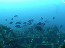 土肥でこの時期の希望はもちろん限定開放ポイント「八木沢沖漁礁」です。ウチはいつものように少人数ですので他のグループの船に便乗させてもらって行ってきました。透明度もバッチリで水面付近からでも20m以上ある水底が見えます。ただ水温はかなり低いです…ドライスーツとフードとグローブってたいした道具ですね。おかげでこの水温でもたいした辛さなく潜れるのだから。顔などのあいた場所は確かに冷た〜いですが。さて沖漁礁、魚影は絶好調!じゅうたんのように漁礁を覆うネンブツダイと潮上に雲のように群れるイサキの子の大群と流れる大きめのマアジの群れ、ブロックの上にジットしている大きなヒラメと30匹くらいの群れになって迫力の光景を見せるイシダイ軍団。もちろんウミトサカをはじめとするソフトコーラルも通年あいているポイントではまず見られない豊かさです。あっというまに40分の潜水時間が過ぎてゆきました。このときにはちょうど船3隻分の多くのダイバーが入っていましたがどの人も大喜びの声を上げていました。