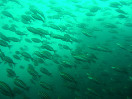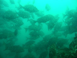 ・下にある台風が2つになりました。天気は晴れ、風は東寄り。西伊豆には悪くないコンディションですがさすがにうねりが少し出てきました。フトネなら問題はありませんでした。残念ながら透明度がパッとしません。(午後には25mより下にはきれいな水が入ってきていました)水温も20m付近でも22℃はあって助かります。でも魚の多さはかなりのものです。特にイサキはスゴイ数です。浮遊物が多く濁り気味の中層ですが目前を行ったり来たりしてくれるので飽きません。タカベやマアジ、大きなマダイの編隊も迫力満点です。そして今日の迫力No.1はハマフエフキの数十匹の大群です!ただでさえ大きな魚なのに大群でいると異様な空気さえ漂います。多いときに200匹の大群にもなるようです。これで透明度さえ上がってくれれば西伊豆の海、絶好調宣言なのですが。。劇的に変わってもいいよ! 写真は(特に浅場の)透明度に難アリですが魚いっぱいの雰囲気を察してください。