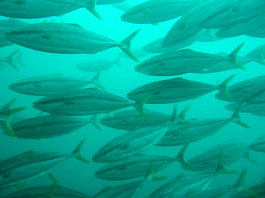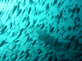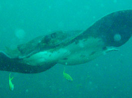 ・昨日のログで安良里では季節外れのトビエイがバリバリ…とか書いたので安良里ボートのリクエストをいただきました。そういう時に限ってあらわれなかったりして、などとちょっぴり嫌な予感も抱きつつ。うーん、頼むよトビエイ君、まず安良里の沖の根に潜ってきました。 天気は晴れと曇りの中間くらい。海は静かでした。潮流もユルユルと。透明度は多少白っぽいけど何のストレスもないくらいは見えています。(2ダイブ目には水面から5mあたりまできれいで暖かい水でした) 西根に行くと巨大マダイ軍団やメジナの群れに混じってじすぐにトビエイが出てきました。わりと簡単に数匹のトビエイが飛んでいるのが見えました。中にはすごい接近するヤツまで。「ほっ!」とりあえず一安心。根の北側に行くとスズメダイとメジナが混じった分厚い群れが私たちをとりまいてくれたり。魚影とっても濃いです。 そして2ダイブ目は今年から開放された御黄金(ミコガネ)へ。水深5mから沖側は40mまで落ちているダイナミックな隠れ根です。根の周りのゴロタには手付かずのソフトコーラルも豊富できれいです。そのなかにベニイザリウオがいたり。でも今日はやっぱり魚群が圧巻でした。スズメダイは沖の根に負けず劣らずの多さ、イサキマアジ、タカベもなかなかの群れ、安良里らしさはマダイの群れとメジナの大群でしょうか。そしてビックリしたのは予想していなかったワラサの大群でした。1分もあったかわかりませんが嵐が来たようでした。一瞬他の魚たちが急に泳ぎだした(逃げ出したように)と思ったら視界がすべてワラサの壁になりました。ガンガン走って目の前を行ったり来たり。すばらしいスピード感とすごい迫力でした! 他にも沖の根でハナタツや御黄金で目立ってきたクマノミたちなど。 水温や透明度は遅れ気味(これも良くなってきてるし)の伊豆ですが魚影は見ごたえ十分です。トップシーズンに入ってきたこの光景、見逃すのはもったいない!