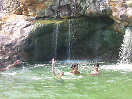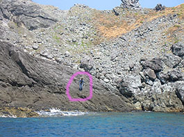 すぐ横の海に温泉が流れ落ちる入り江は今回は深さ十分。ほとんど足が付きません。泳ぎながらお湯の方へ。でも流れ落ちるお湯は熱〜いです。うねりに運ばれてアチチッ!