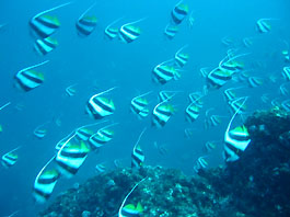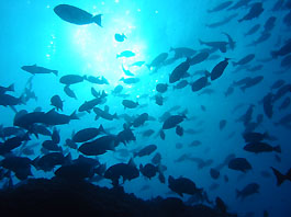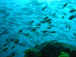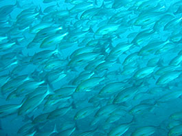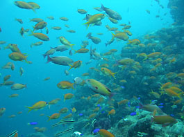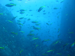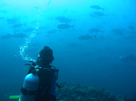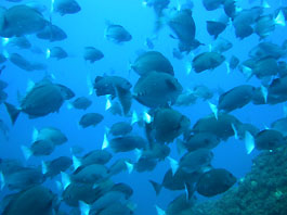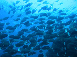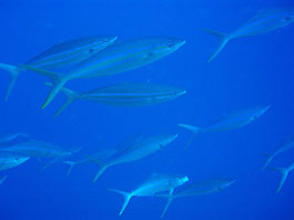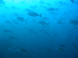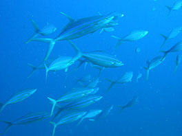 南の海では良く見られるギンガメアジの大群はトカラ列島あたりでは良く見かけます。しかし沖縄ではほんの数箇所だけのような。それともダイバーが潜れない場所にはいるのでしょうか?それともウミンチュウがみんな獲ってしまったのでしょうか?