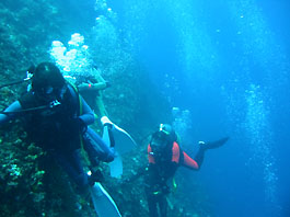 海面から顔を出す岩に当たった潮流は水面近くは上へ上へと吹き上げます。そこを負けずに突破して岩にとり付けるかどうか。メンマーのみなの気持ちになりながら潜降してみます。