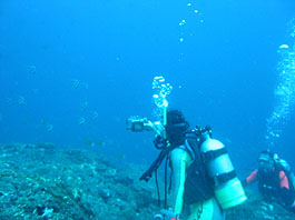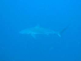 今回の湯瀬は透明度はイマイチ(15〜20m)でした。そんな中大きなメジロザメの野郎がずっと我々の横を泳いでいました。はじめは2匹、次には3匹、実はもっとたくさんのサメがあきらかにこちらをうかがっていました。しかも大きいのです。パラオやモルディブで見るメジロザメよりずっと感じの悪い奴らです。