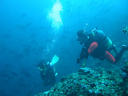 して、水中は透明度はいまひとつだったのですが魚影はさすがでした。メジナ、ニザダイなど地味な魚とは言え数は圧倒的でした。他にも短時間ながらサワラやタカベの群れなどを見ることができました。