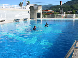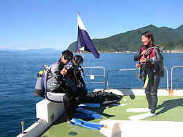 ・抜けるような青空の1日でした。心配された海況も土肥では拍子抜けするくらい穏やかです。 今日は初心者講習の(昨日はプール)初の海の方たちと先月Cカード取得した方たちの初ファンダイブと初々しいな顔ぶれでした。朝ウチの近くの旅人岬から海を見ると少しうねりがあったので静かな通り崎でのダイビングにしました。海の中もおだやかできれいですご〜く気持ちよかったです。ステージの上から水底がはっきり見えていて魚も上から探せそうなくらいでした。海の中ではムレハタタテダイ、チビミツボシクロスズメ、インドヒメジの子など南の魚もよくみかけます。浅場は明るいのでいつもの顔ぶれながらソラスズメダイの群れがとてもきれいです。メンバーの方はキビナゴの群れが通ったり、若いアオリイカの編隊などを見て喜こんでいました。
