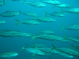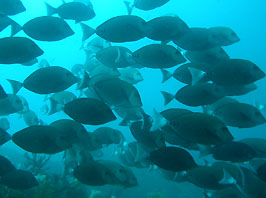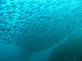 ・台風接近の影響下少しずつうねりが入り始めました。北東の風もかなりの強さでした。でも土肥地区は問題があるほどの影響は今日のところ出ていませんでした。そして土肥のボートは小下田地区へ。サク根へ2本潜ってきました。サク根は恋人岬の下にある巨大な根で北側は70mまで落ちるダイナミックな地形です。潮通しもよく当たればすばらしい魚影に会うことが出来ます。 そして今日は当たりました!! とにかく群れ群れ! キビナゴの大群から始まって突っ込むカンパチツムブリ連合軍団、大マダイ編隊、イサキ大群、タカベ大群、ニザダイ大群、サクラダイぐっちゃり、スズメダイ壁などなど。なかなか潮も流れていたので魚群たちの動きもスピード感たっぷり。イナダとワラサの中間?のブリッ子の群れやらキビナゴを追い回すシイラ編隊まで登場してくれました。飛島沖と並ぶ伊豆随一のダイナミックポイント(土肥周辺の人はそう思っています)のスーパーサク根、堪能できました。
