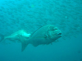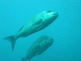 沖の根では1本目よりちょっと濁った感じでしたが魚影はさらに増えました。シラスのようなキビナゴからそこそこの大きさのキビナゴまで根を覆うくらいの数です。そしてここにもマダイ軍団が並んでいました。ダイバーが近づくと横目で見ているのがわかります。こんなに堂々としているサカナってほかにいたっけ?安良里はなぜかマダイの大群が良く見られます。一見の価値アリですね。
