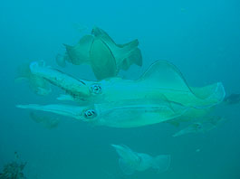 ・夏休み期間真っ只中の海辺です。土肥の海水浴場はとても賑やかで華やかです! さて、今日はのんびり黄金崎ビーチでした。My器材初使用のお二人はうれしさとドキドキが入り混じってのエントリー。水は思ったより明るく(しかも青っぽい水)て意外な気分。水温も温かかったです。そんな中を砂地をゆる〜りたら〜りと泳いでBCの扱いなんかを実感してもらったりしてました。でも明るくて気持ち良かったです!途中ウミテングや小さなムレハタタテダイの幼魚が見れました。 2本目はアオリイカの産卵シーンを満喫しました。約30杯のアオリイカが私たちにお構いなし状態で間近で産卵行動をしていました。今年はじつに見事です。おふたりもすっかり見入っていました。他にもシマアジの子、カンパチの子、吹っ飛んでゆくサバ?マダイ、みんな小さなシラス?を追いかけていました。愛想のいいネジリンボウも相変わらず姿を見せてくれていました。