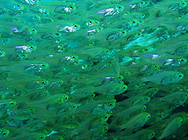 ・今日は午後から黄金崎に行きました。一昨年に体育系女子大の講習でサカエが担当した女の子2人が潜りに来てくれました。 海はとても穏やかです。水もまずまずきれいで特に浅場はすごく気持ちいいです。とにかく魚が多いです。イワシの子やら何かの子やら小さい魚たちがず〜〜っと群れています。それをカンパチ、シマアジ、マダイ、ツムブリなんかが追い回しています。エリアの境まで行くとスズメダイやイサキの大群も混じって気がつくとビックリするくらいの魚群に囲まれていたり。その他も小さなハナタツ、小さなミジンベニハゼ、ニシキフウライウオ、アジアコショウダイの幼魚、キンメモドキの群れなどぜんぜん飽きない水中です。賑やかな伊豆のベストシーズン突入です!