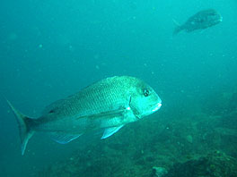 2本目は御黄金。なぜか潮上ではなくブイのあたりでイサキやスズメダイが群れていました。根の上手にはマダイがい〜っぱい!フテブテシイ顔で横目でこっちをみる大きなマダイは迫力満点。ワラサなども混じってたむろしています。かなり異様な光景です。。そのためにイサキなんかが避けていたのか、って考えちゃいました。