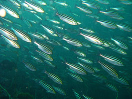 ・10月の3連休です。 なんだか9月から3連休ですってばかり書いている気がします。 土肥の101では連休と言うほど多くのダイバーはいない感じです。数年前まではこの時期でも連休の時にはダイバーでごったがえしたような気がします。まぁ、混みあっているよりは適度な人数の方がのんびり過ごせていいのですが。 さて、海は台風のうねりが確実に来ています。海を波となって伝わるエナジーってホントすごいです。 でもなんとか飛島沖に行くことが出来ました。もちろん水中でも横揺れはありますがまだそれほどひどくはありません。水深10mの根頭まで潜降したらヒョイヒョイと適度な水深までおりてしまいます。 透明度はまずまず(ところにより8mくらいで濁り気味)、水温も水深25mに行っても22℃くらいでした。 1本目は流れはほとんど無くて魚たちもどこに集まっていいのかわからない状態。でも魚の数はいっぱいいるのです。 2本目は限定開放の「飛島沖 Part2」からスタートです。ロープ伝いに下りるといきなりそこの水深が20mと深めなのでいつもはあまり好まないのですが今日のようにうねりがあるときには着底しても浅場ほど横揺れに苦労しないので都合がいいくらいです。2本目は飛島沖らしい魚影炸裂です!西の根にもイサキ、スズメダイいっぱいで群れていて、南の根に行くとイサキ、タカベショー全開となりました。ワラサの群れやメジナの大群も登場。大きなマダイ編隊や大きなコロダイもいますがイサキの大群に埋もれていました。 1本目は飛島沖にかけた期待からするとちょっと物足りない魚の数でしたが、潮も動いてきた2本目はキッチリと腹いっぱい魚の大群を堪能させてくれました。さすが飛島沖!