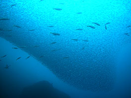 ・今日も雲見へ行ってきました。 今日は1日曇りで気温もあまり上がりませんでした。でも天気予報で言っていたほどの寒さは実感しませんでしたが。 海は多少のうねりがあったり沖は波立っていたりしましたが東風なのでほぼ凪でした。 水中の好調さは相変わらずです。飛び込んで下を見ると青い水で幸せを感じます!透明度は平均で15mくらい。小牛の白い砂地のあたりはホントに明るくて気持ちいいです! ただ潮流が速めでコースを選びながら進む必要がありました。でもその分キビナゴ大群はガンガン走っていました。それらを追うカンパチやワラサ、マアジの大群なども混じって私たちの周りは魚群だらけになったりしました。 他にもいつものクエや大きなイシダイ多数、テングダイ、キンメモドキ群れ、ベニカエルアンコウ、カミソリウオなど。 11月中旬ですが水温も20℃以上あるし、透明度は良いし、魚も多くてバッチリ。楽しい海が続いています!