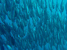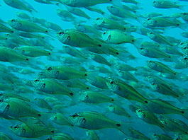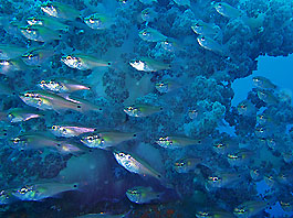 2本目はいつもの桟橋のまわり。透明度は外海に比べると落ちてしまいますが中層にはキビナゴの大群とイナダ軍団。石垣のあたりの魚影は見事!上にはスズメダイとキビナゴ。下にはネンブツダイとクロホシイシモチが絨毯のように群れています。ムレハタタテダイの小群れやキンギョハナダイの群れも混じっていますがこの一帯はスゴイ魚の密度、うっとりしてしまいます。