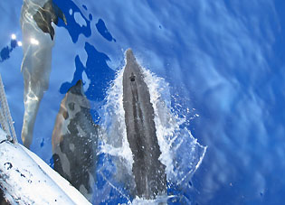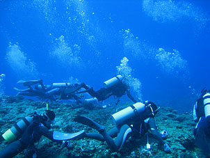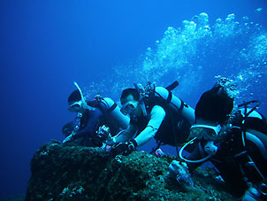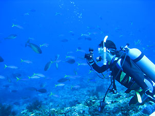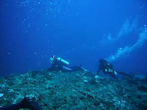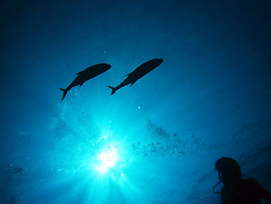 この島でのお楽しみは泊まる海游倶楽部の存在です。中之島の中でも標高の高い場所にあり昼は暑くても夜はとっても涼しくなります。そしてなによりおいしいお食事が大きな楽しみです。こんな僻地(失礼)でこんなお食事が出来るとは驚きです。 そして、今回はとっても星がきれいでした。ちょっと明かりから離れると満天の星空です。天の川だってはっきり見えました! ダイビングも中之島の平瀬やトウセロといった楽しいポイントに潜ってきました。 巨大ロウニンアジたちやギンガメアジ群れ、イソマグロなんかは当たり前のように現れてくれました。 潮もゴキゲンに流れ、それが普通に思えてきます。トカラにいると潮流に対する感覚が狂います。 「今日は流れが無かったね」 と メンバーの方 「ちゃんとありましたって!」 |