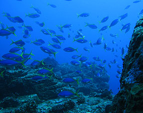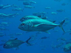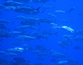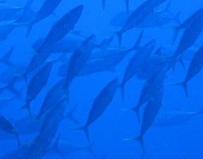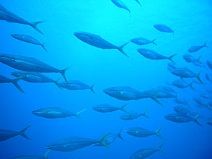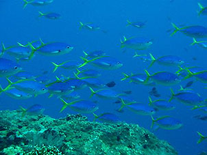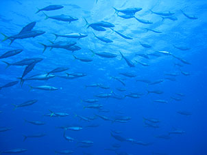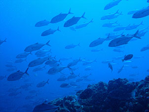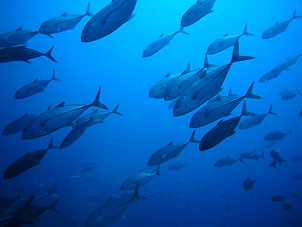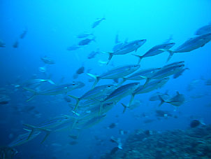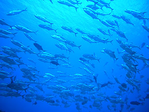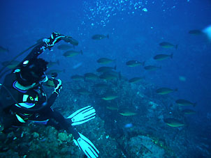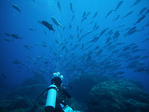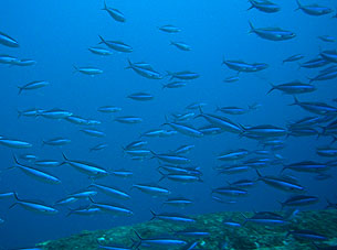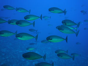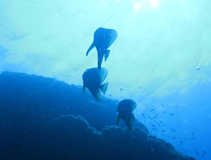 海は凪。船は滑るように走り、クルーズ2日目ついにトカラ海域です。 さあ、トカラでのファーストダイブはニヨンです。 ニヨンはトカラの最も北部にあるいくつかの低い岩のエリアです。海はA級、潮流はいつも速い緊張の場所です。 イチ、ニのサンッで飛び込むとそこは真っ青の世界。ウメイロモドキやムレハタタテダイの大群が目に飛び込みます。 ムレハタタテダイはあいかわらずいっぱい!ギンガメアジはやや遠め。水温が高いせい? でも巨大イソマグロが悠然と泳いでいたり。 さすがです! |