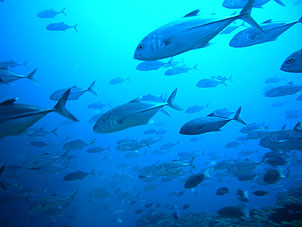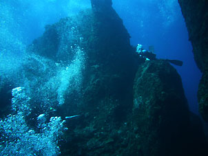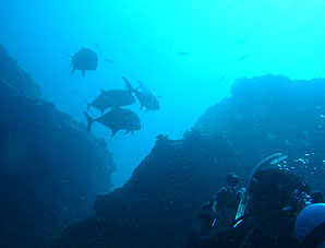 常に黒潮が流れ水面には潮波が立ちます。 でも水中は魚たちの世界。 しかし、この時期の水温は30℃を超え、多くの魚たちは深場へと移動します。 でもこの岩の下では今年も浅場から深場まで繰り広げられていたギンガメアジたちのパラダイス! |